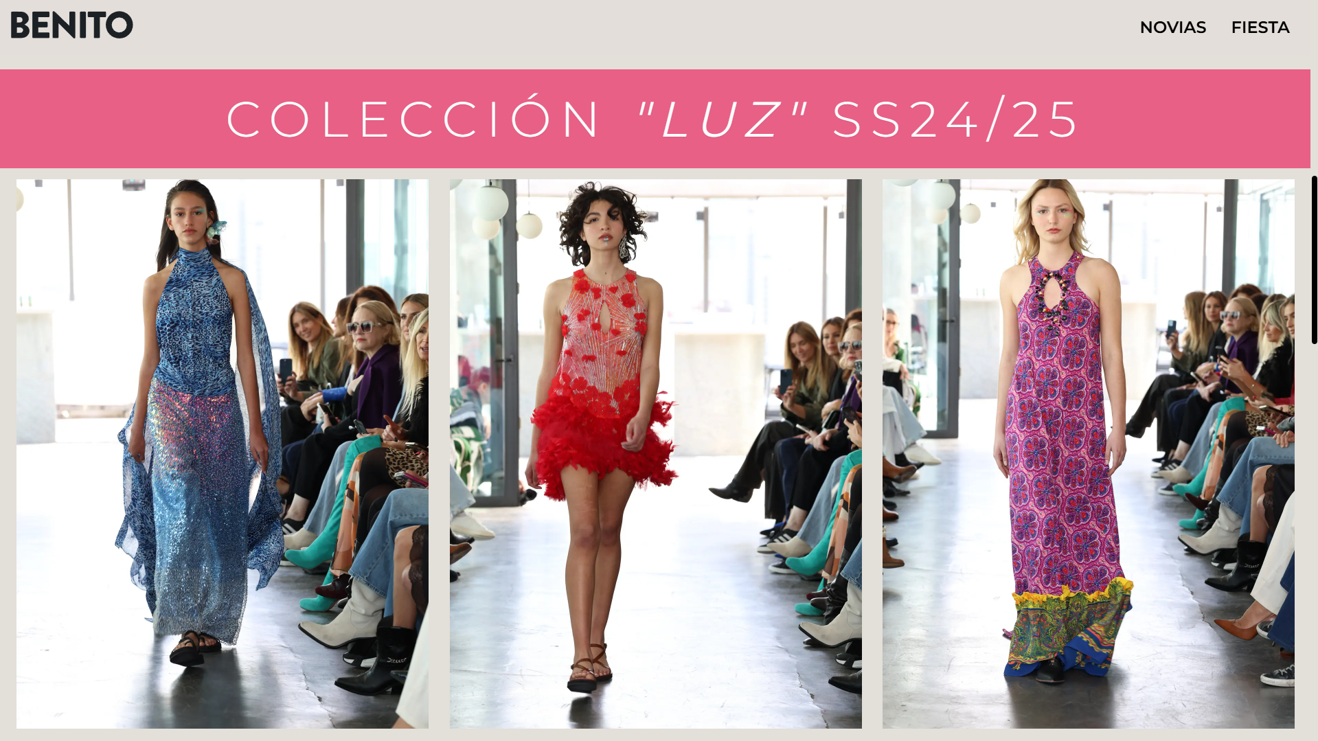 Uno de los focos principales de la página es la presentación de la colección "Luz" SS24/25. A través de imágenes cuidadosamente seleccionadas, los usuarios pueden explorar los diseños vibrantes y únicos que caracterizan esta colección. Cada elemento visual está pensado para sumergir al visitante en el mundo colorido y elegante de Benito, invitándolo a descubrir cada detalle.